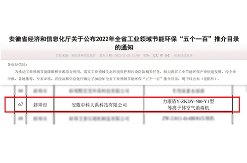 • 入選2023年全省工業(yè)領(lǐng)域節(jié)能環(huán)保“五個一百”推介目錄(節(jié)能環(huán)保新產(chǎn)品新裝備:G-ZKDY-2500-Y1型等離子體空氣消毒機)